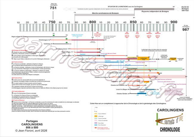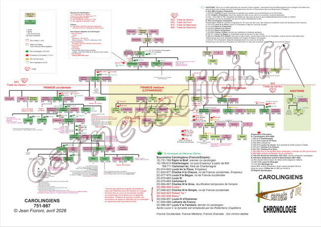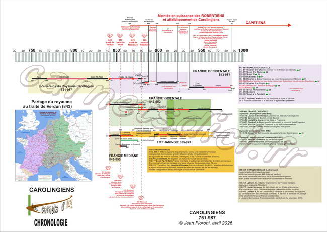 | Chronologie Carolingienne Carte inédite par Jean Fioroni - Original : A2 Pas de zoom pour le moment ![]() Sur cette carte : Chronologie Francie Occidentale (843-987 Chronologie Francie Orientale (843-962) Chronologie Francie Médiane (843-855) Chronologie Lotharingie (855-923) Traités de partage du territoire : Verdun (843, Prüm (855), Meersseen (870), Ribemont (880) Montée en puissance des Robertiens (866-987) |
