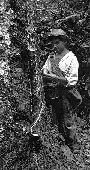 Les sources du caoutchouc sont nombreuses. Le lait végétal, le latex dont il est fait, coule d'un grand nombre de plantes appartenant à des familles variées. Mais l'Hevea brasiliensis dépasse de beaucoup toutes les autres par la proportion de gomme contenue dans son suc. Ce n'est pas l'un des colosses de la forêt amazonienne, mais néanmoins un bel arbre dont les feuilles trilobées peuvent monter jusqu'à 30 mètres et dont le tronc gris peut atteindre 3 mètres de tour. Cahuchu, le bois qui pleure, disaient les Indiens. A son don des larmes, il associe un caractère solitaire. Jamais un seringa ne recherche le voisinage d'un autre seringa. Il vit à l'écart, met de 100 à 200 mètres de broussailles entre son semblable et lui. Mais l'Amazonie est si vaste que des millions d'hévéas s'égaillent des marais de l'estuaire aux terres escarpées des contreforts andins. |