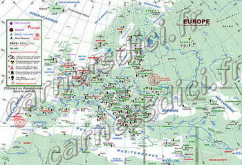| Carte inédite Géographie et Géopolitique de l'Europe par Jean Fioroni - Original : 88x61 cm Pas de zoom pour la moment L'original est à la vente (formats A2) - Email Outre les repères géographique sont indiqués sur cette carte : les pays et leurs régimes (république, monarchie, principauté), leurs rangs en production de pétrole, de gaz, de charbon et d'uranium, les capitales ainsi que de nombreuses information telles que, par exemple, les zones où ont eu lieu des essais nucléaires. ![]() Voir légende des cartes |